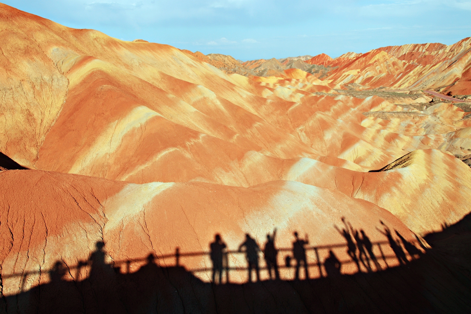 칠채산(七彩山)는 ‘대지의 팔레트’라고도 불리는데, 붉은 사암층이 수 천만 년에 걸쳐 만들어낸 대지의 예술입니다. 일몰 시 붉은 단층이 빛에 반사되어 환상적인 색의 향연을 이룹니다.